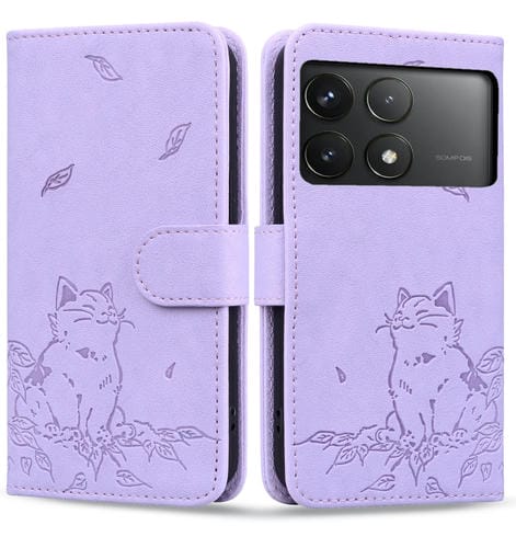 Funda de Cuero con Estampado de Gato para Xiaomi Poco F6 Pro 5G (Morado)