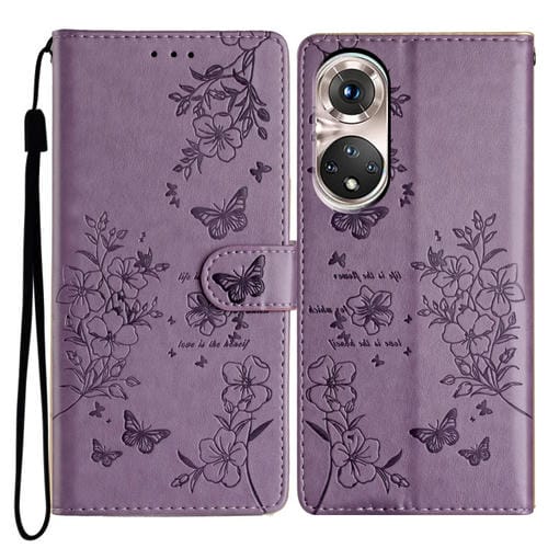 Funda de Cuero con Relieve Mariposa y Flor para Huawei P50 Pro (Morado)