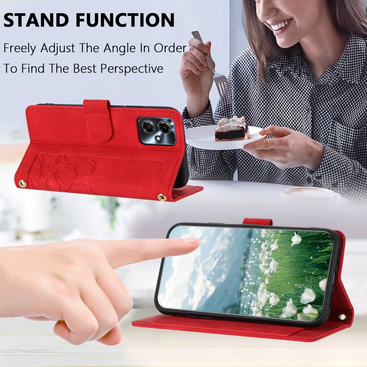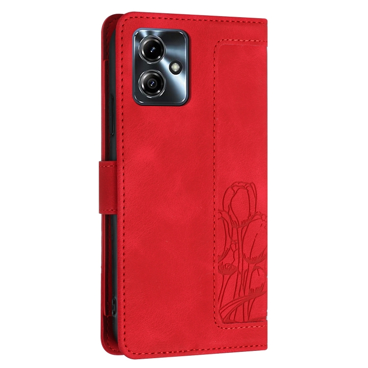 Funda de Cuero con Relieve de Tulipanes para Motorola Moto G14/G54 con Cordón (Rojo)