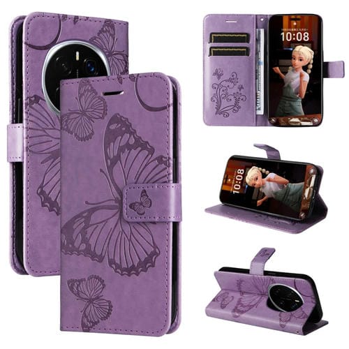 Funda de Cuero con Tapa para Honor Magic7 Pro con Mariposa en Relieve 3D (Morado)
