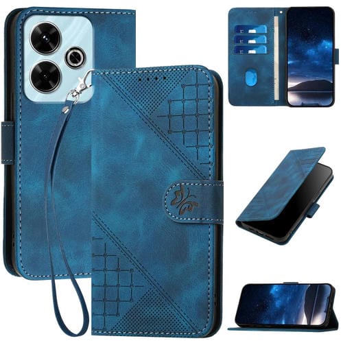 Funda de Cuero con Tapa y Cordón para Redmi 13 Yx0080 con Diseño En Relieve de Mariposa y Cuadrícula (Azul Oscuro)