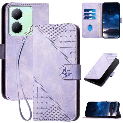 Funda de Cuero con Tapa y Cordón para Vivo Y36 4G Global Yx0080 con Diseño En Relieve de Mariposa y Cuadrícula (Morado Claro)