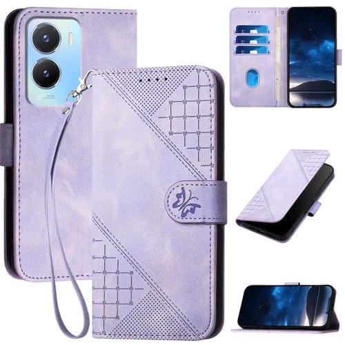 Funda de Cuero con Tapa y Cordón para Vivo Y56 5G Global Yx0080 con Diseño En Relieve de Mariposa y Cuadrícula (Morado Claro)