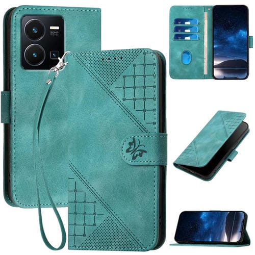 Funda de Cuero con Tapa y Cordón para Vivo Y77 5G Global Yx0080 con Diseño En Relieve de Mariposa y Cuadrícula (Azul Claro)