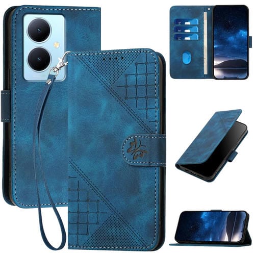 Funda de Cuero con Tapa y Cordón para Vivo Y78 5G Global Yx0080 con Diseño En Relieve de Mariposa y Cuadrícula (Azul Oscuro)