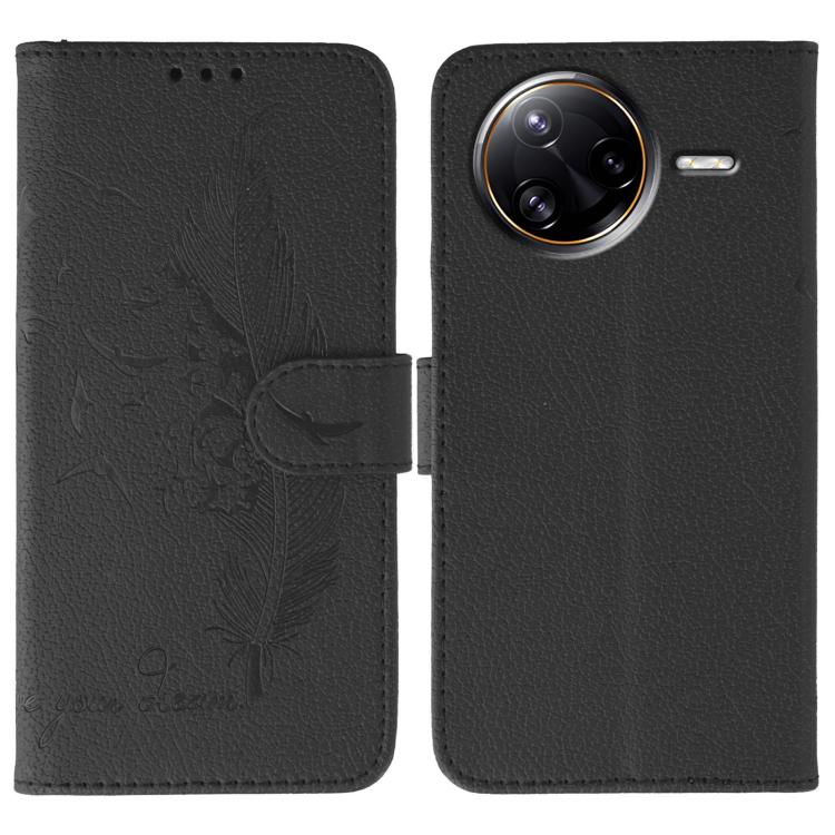 Funda de cuero con textura de lichi y estampado de plumas para Xiaomi Poco F7 Ultra / Redmi K80 Pro (negro)