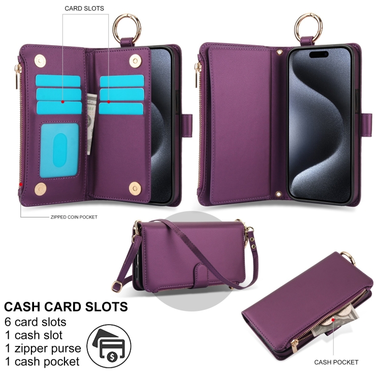 Funda de Cuero para Teléfono iPhone 14 Pro con Billetera Multifuncional y Anillo Cruzado (Morado Oscuro)