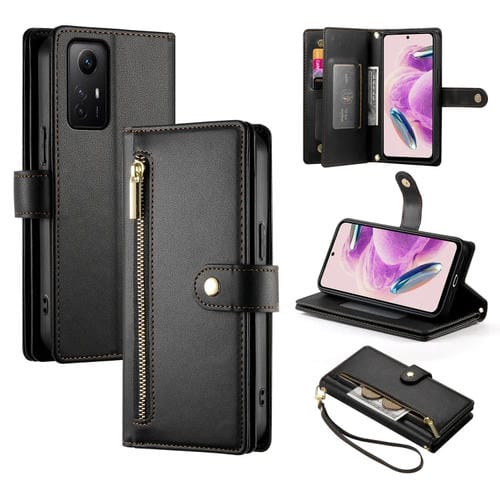 Funda de Cuero para Teléfono con Nueve Ranuras para Tarjetas y Cremallera para Redmi Note 12S 4G/Note 11 4G (Negra)