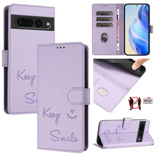 Funda de Cuero Rfid con Relieve Sonriente para Google Pixel 7 Pro (Morado Claro)