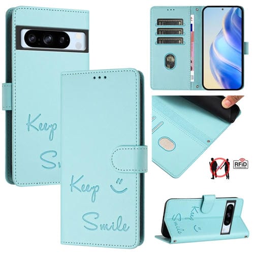 Funda de Cuero Rfid con Relieve Sonriente para Google Pixel 8 Pro (Verde Menta)