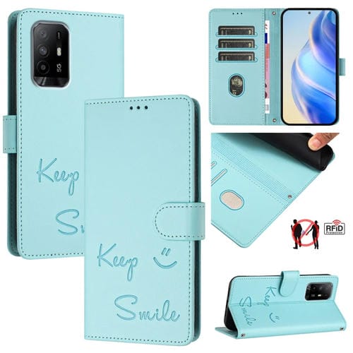 Funda de Cuero Rfid con Relieve Sonriente para Oppo A95 4G Global/Reno6 Lite (Verde Menta)
