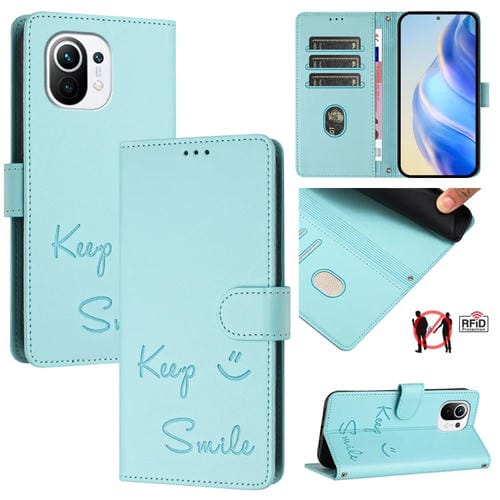 Funda de Cuero Rfid con Relieve Sonriente para Xiaomi Mi 11 (Verde Menta)