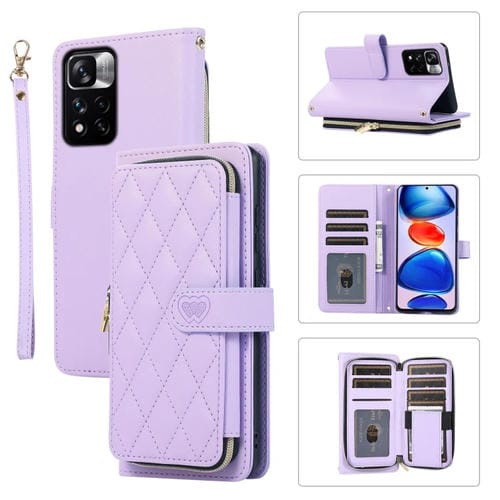 Funda de Cuero Tipo Billetera con Cremallera Completa y Diseño Rombal para Redmi Note 11 Pro (Morado)