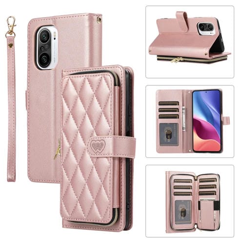 Funda de Cuero Tipo Billetera con Cremallera Completa y Diseño Romboidal para Redmi K40 (Oro Rosa)