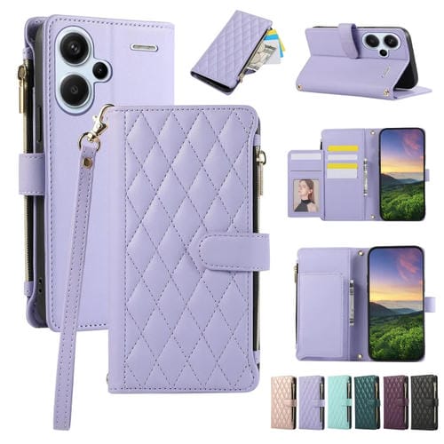 Funda de Cuero Tipo Billetera con Cremallera Rombal para Redmi Note 13 Pro+ 4G/5G (Morado)