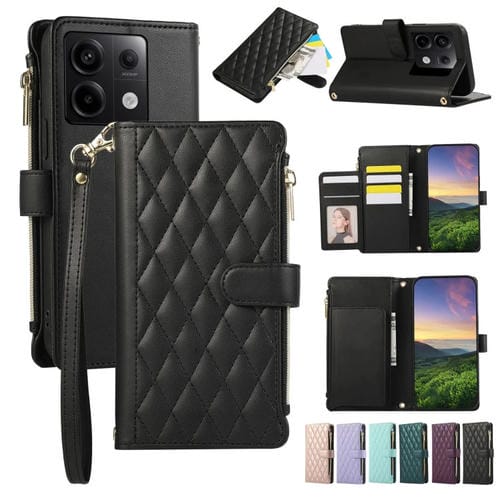Funda de Cuero Tipo Billetera con Cremallera Rombal para Redmi Note 13 Pro 5G (Negra)