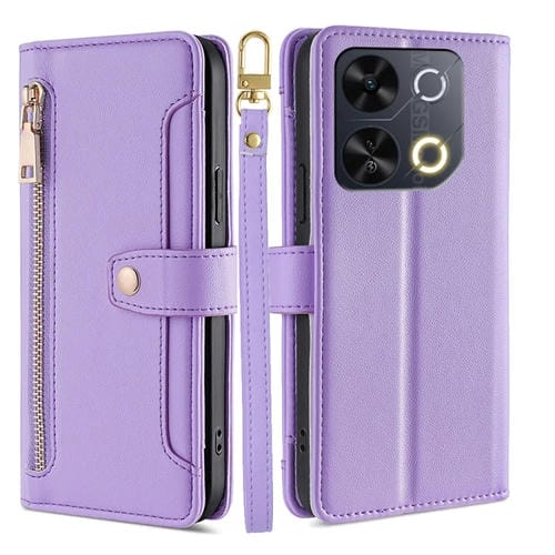Funda Cuero Tipo Billetera Itel P65 con Cremallera Diseño Cruzado Textura Oveja (Morado)