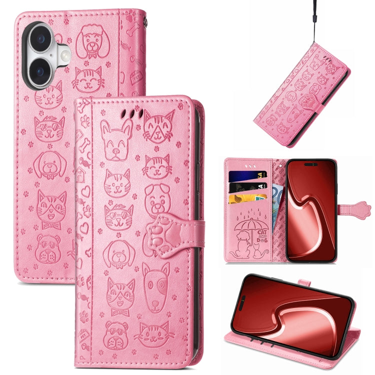Funda de Piel con Relieve de Gato y Perro para iPhone 16 (Rosa)
