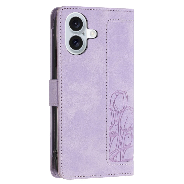 Funda de Piel con Relieve de Tulipanes para iPhone 16 con Cordón (Morado)
