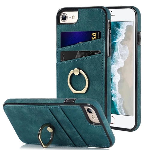 Funda de Teléfono de Cuero con Parche Vintage con Soporte para Anillo para iPhone Se 2022 / Se 2020 / 8 / 7 (Azul)