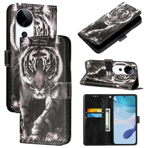 Funda de Teléfono de Cuero con Tejido Liso y Estampado de Dibujos En Color para Vivo S19 Pro (Tigre Blanco y Negro)