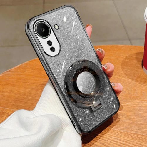 Funda de Teléfono de TPU con Soporte Redondo y Purpurina Degradada Plateada para Redmi 13C 4G (Negra)