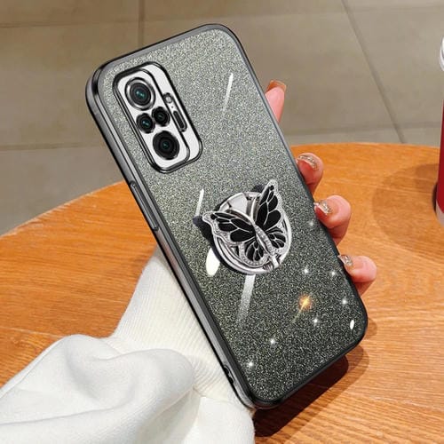 Funda de TPU con Soporte para Mariposa con Purpurina Degradada Plateada para Redmi Note 10 Pro 4G (Negro)