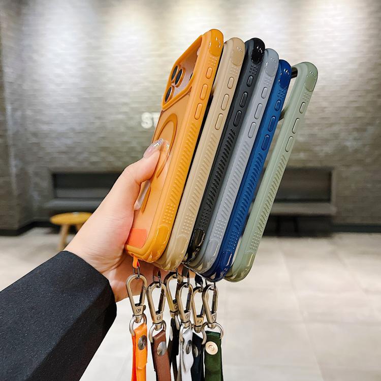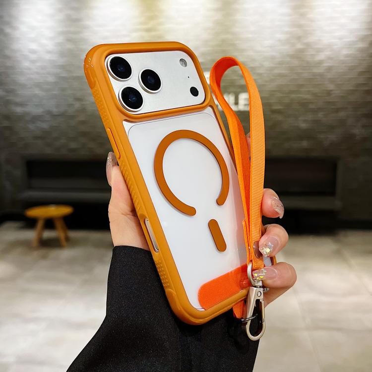 Funda magnética MagSafe transparente con borde liso y correa para la muñeca para iPhone 17 Pro Max (naranja)