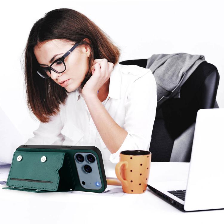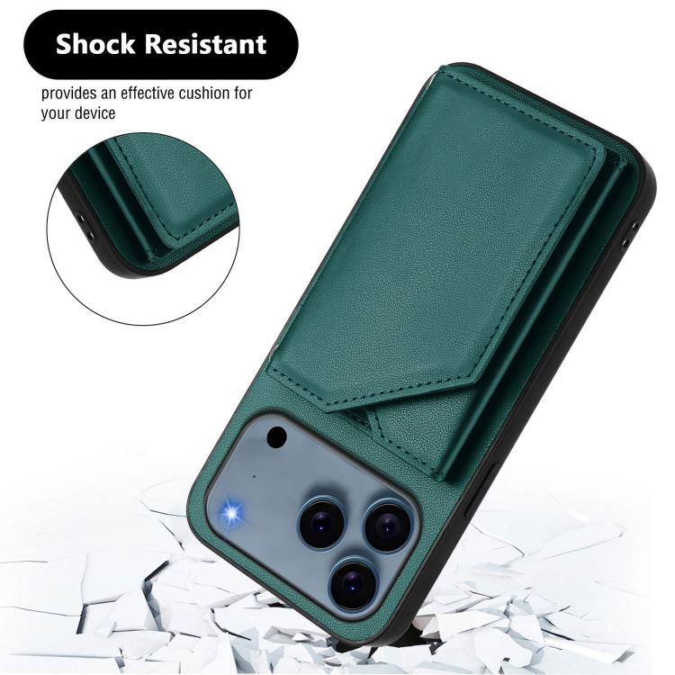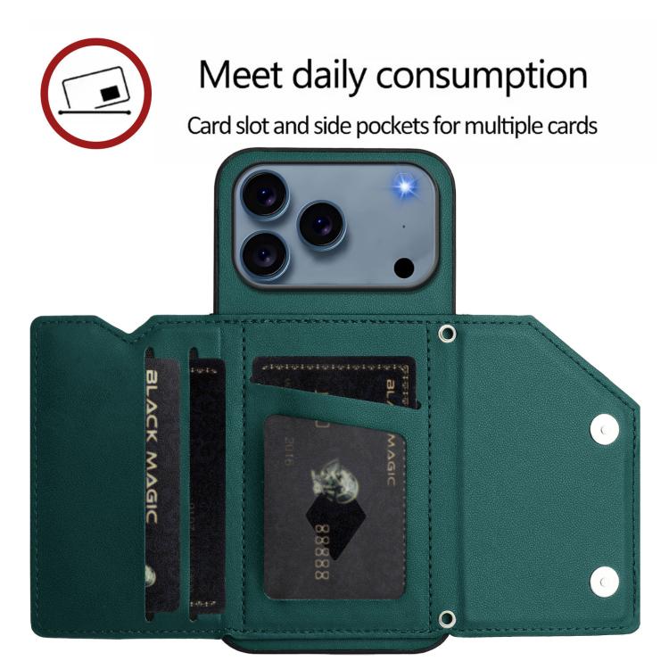 Funda para iPhone 17 Pro con cuatro ranuras para tarjetas y correa para la muñeca (verde)