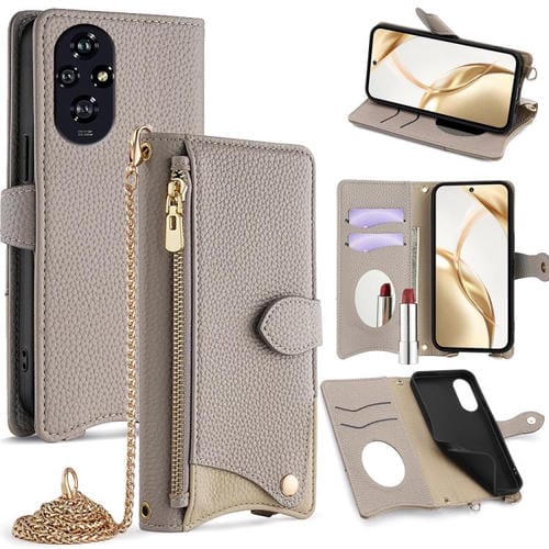 Funda para Teléfono Honor 200 con Cadena Cruzada y Diseño Cola de Pez de Cuero de Lichi (Gris)