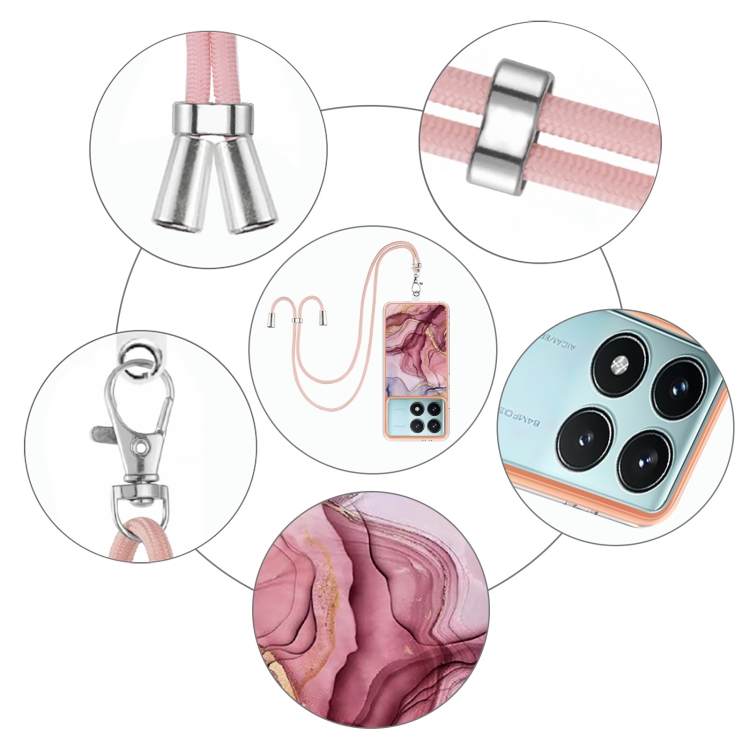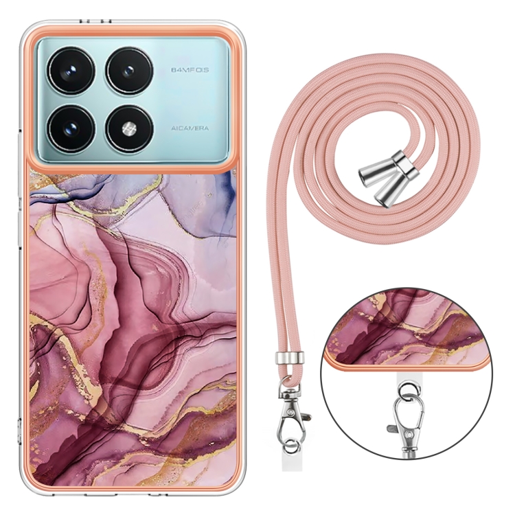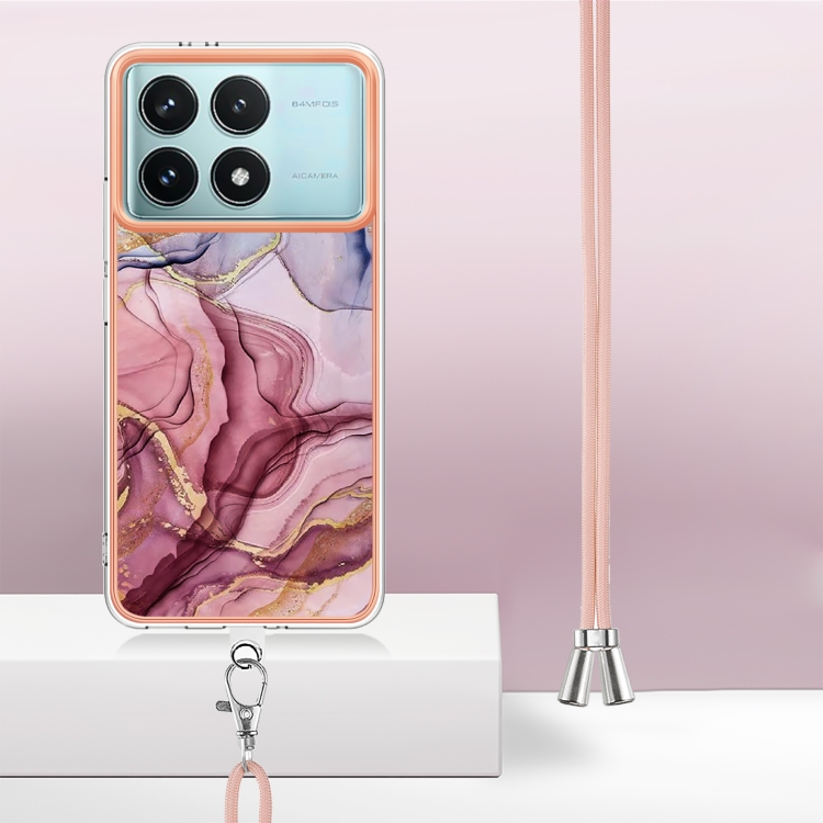 Funda para Teléfono con Imd de Doble Cara con Galvanoplastia de Mármol para Xiaomi Poco F6 Pro 5G con Cordón (Rojo Rosa 014)