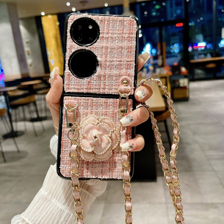 Funda para Teléfono Huawei P50 Pocket Camellia Plaid Fabric PC con Cordón Largo (Rosa)