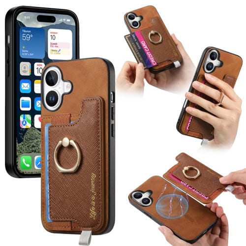 Funda retro Magsafe Cross de cuero con anillo y tarjetero para iPhone 17 (marrón)