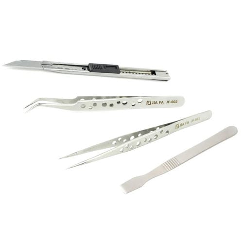 - Incluye 17 herramientas específicas: pinzas, palos capacitivos y puntiagudos, spudgers de doble cabeza, pala pequeña, cuchillo de corte y destornilladores Torx, cruzados, de tres puntos y de tubo en diferentes tamaños