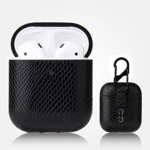 Funda Protectora para AirPods 1 y 2 Piel Sintética Textura Serpiente Anticaída con Mosquetón (Negro)