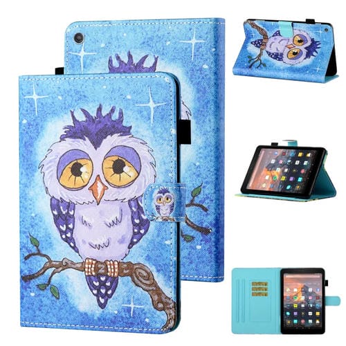 Estuche de Cuero Abatible para Amazon Kindle Fire HD8 (2016/2017/2018) con Soporte y Ranura (Búho Azul)