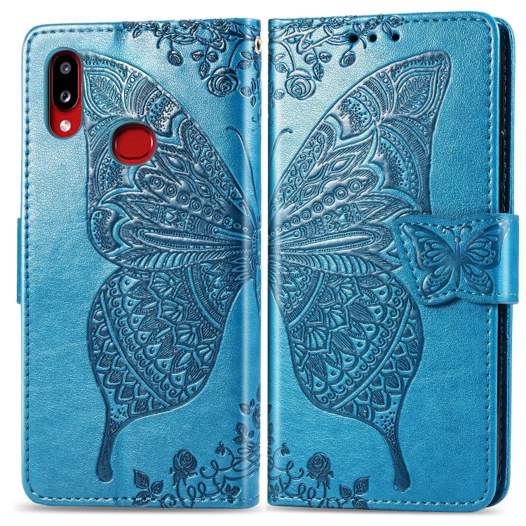 Estuche de Cuero Galaxy A10S Butterfly Love Flowers con Tapa Horizontal en Relieve, Soporte, Ranuras para Tarjetas, Billetera y Cordón (Azul)