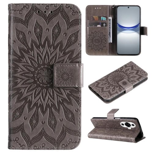 - 1x Funda de Cuero para Huawei Nova 12S con Tapa y Patrón de Girasol en Relieve (Gris)