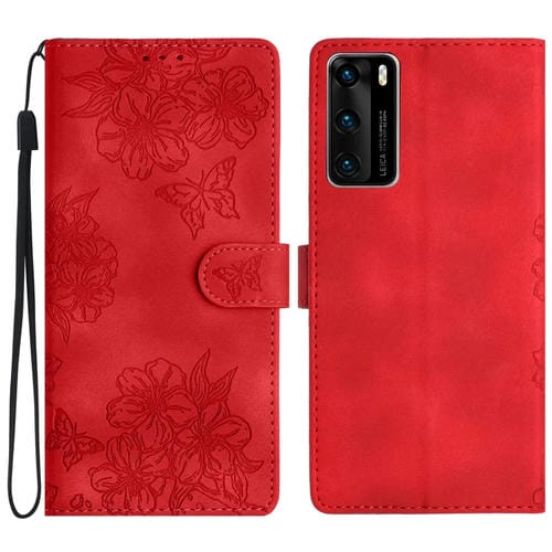 Funda para Huawei P40 Cherry Blossom Butterfly Skin Feel de PU en Relieve (Rojo)