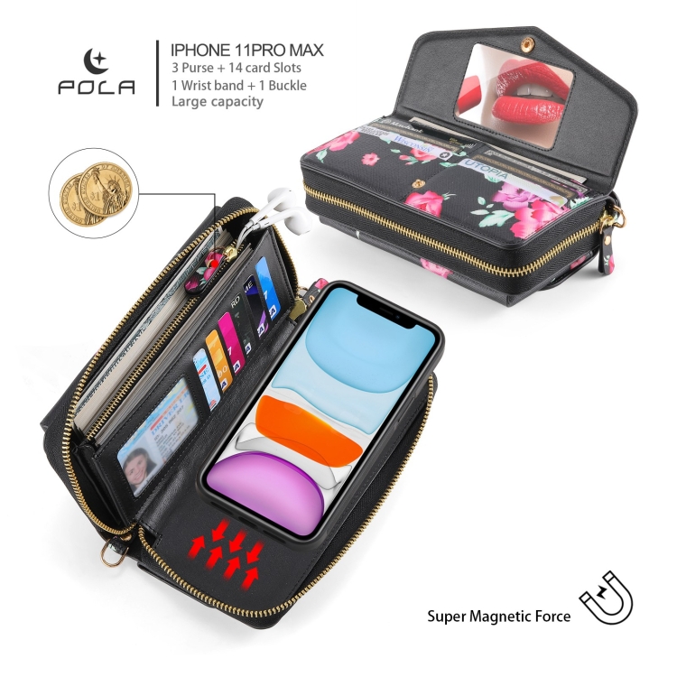 Funda de Cuero Pola Flower para iPhone 11 Pro con Billetera Cruzada Multifuncional y Cremallera (Negro)