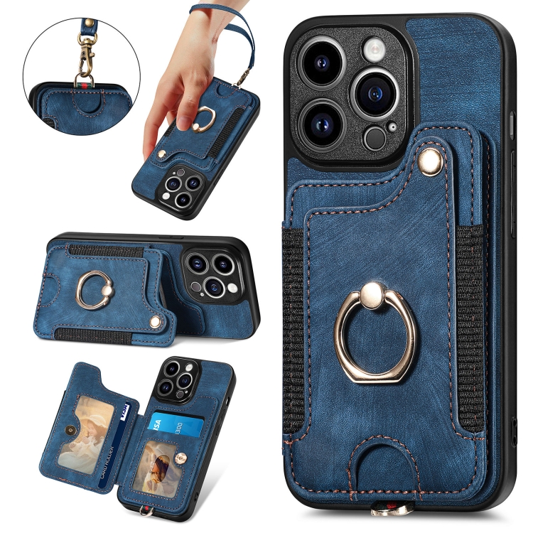 Funda para iPhone 11 Pro Retro Skin-Feel Ring Multi-Card Wallet (Azul)