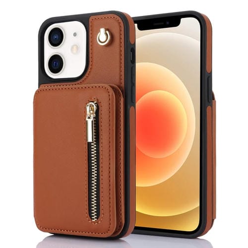 Estuche para Teléfono Ym006 para iPhone 12/12 Pro con Bolsa para Tarjetas y Cremallera con Cordón Doble (Marrón)
