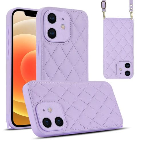 Estuche para Teléfono iPhone 12 con Textura Rómbica y Cordón Doble (Púrpura)