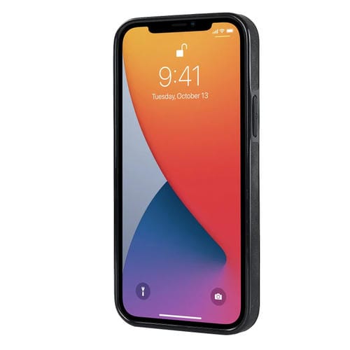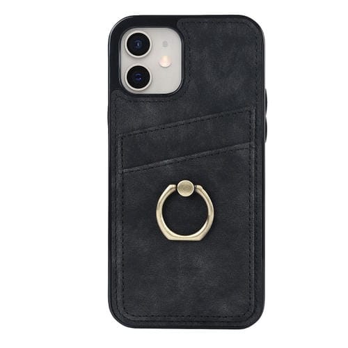 Funda para iPhone 12 Mini de Cuero con Parche Vintage y Soporte para Anillo (Negro)