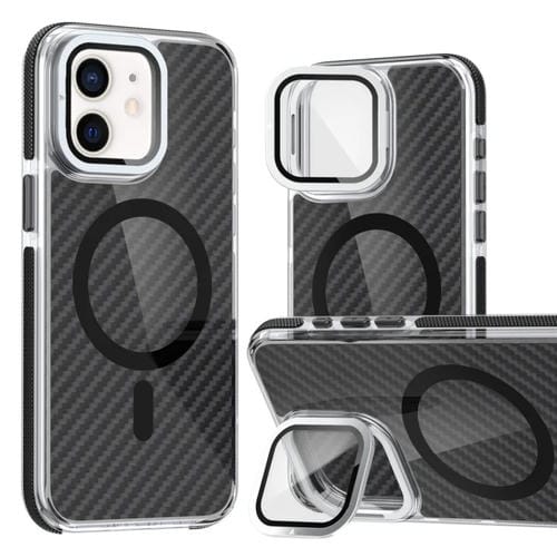 Estuche para Teléfono iPhone 12 Pro / 12 Magsafe con Película de Lente Fibra de Carbono Dos Colores y Soporte Plegable (Negro)