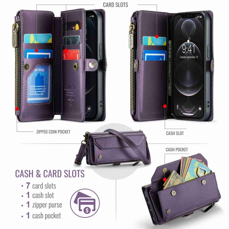 Pour iPhone 12 Pro Max CaseMe C36 Fentes pour cartes Portefeuille à glissière RFID Étui de téléphone en cuir antivol (Violet)