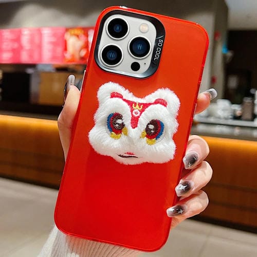 Funda para Teléfono iPhone 13 Pro con Muñeco de Peluche y Danza del León de Año Nuevo (Blanco con Espalda Roja)