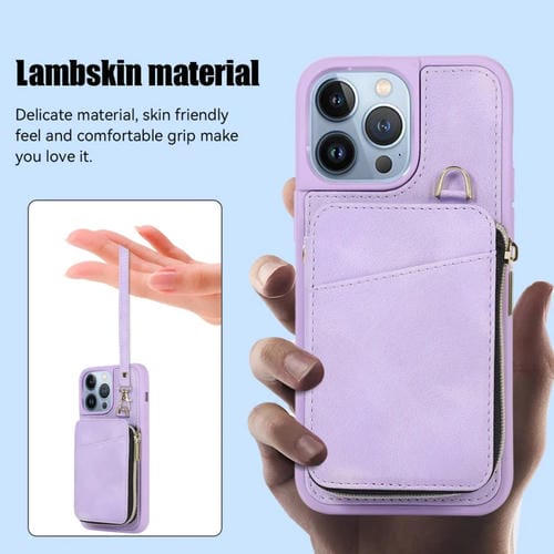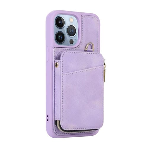 Pour iPhone 13 Pro Max Zipper Card Bag Couverture arrière Étui de téléphone (Violet)