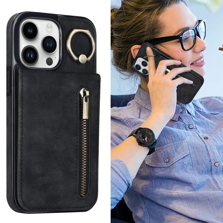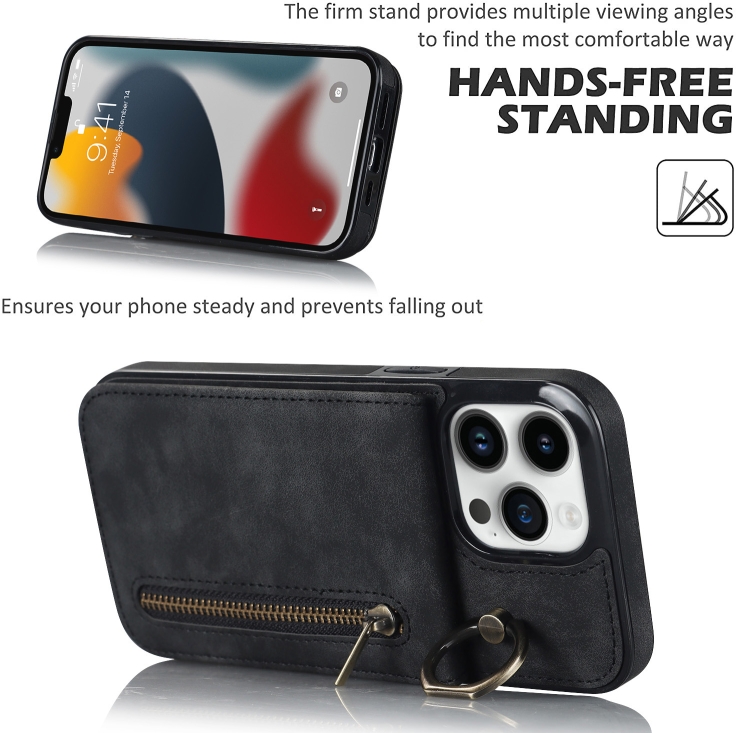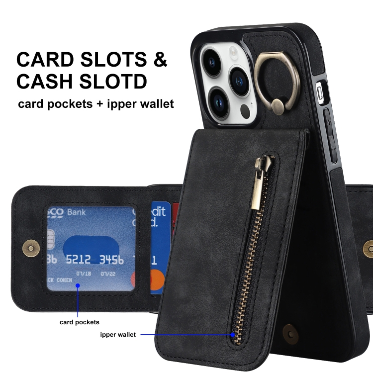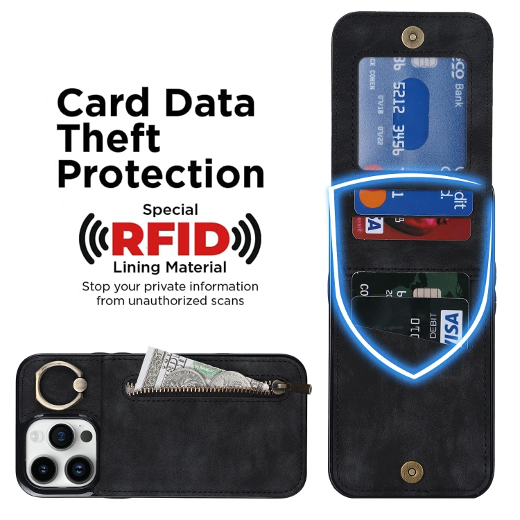 Funda para iPhone 13 Pro Retro Ring y Zipper con Ranura para Tarjeta RFID (Negro)