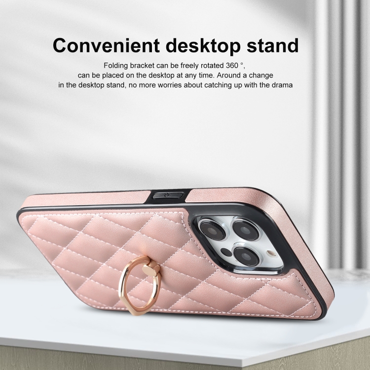 Funda para iPhone 13 Pro Rhombic PU Cuero con Soporte para Anillo (Oro Rosa)